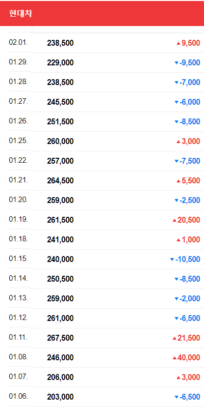 1월6일 203,000원 이던 현대차 주가가 246,000원 까지 오릅니다.