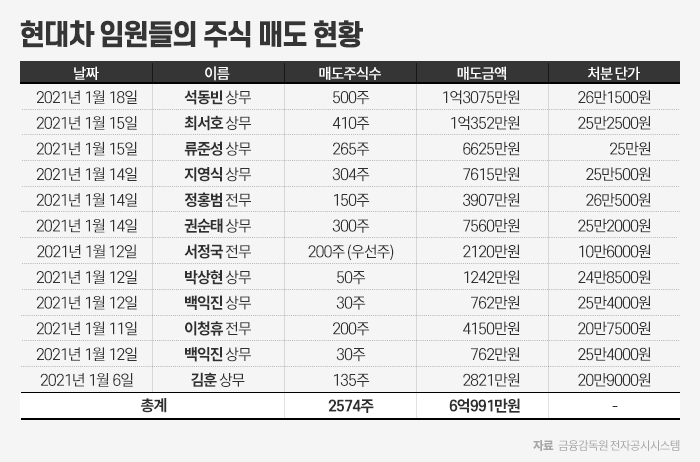 | 2021년 1월 25일 ‘애플카’ 소식 전후로 자사주 판 현대차 임원들 www.newsway.co.kr/news/view?tp=1&ud=2021012215194223266 |